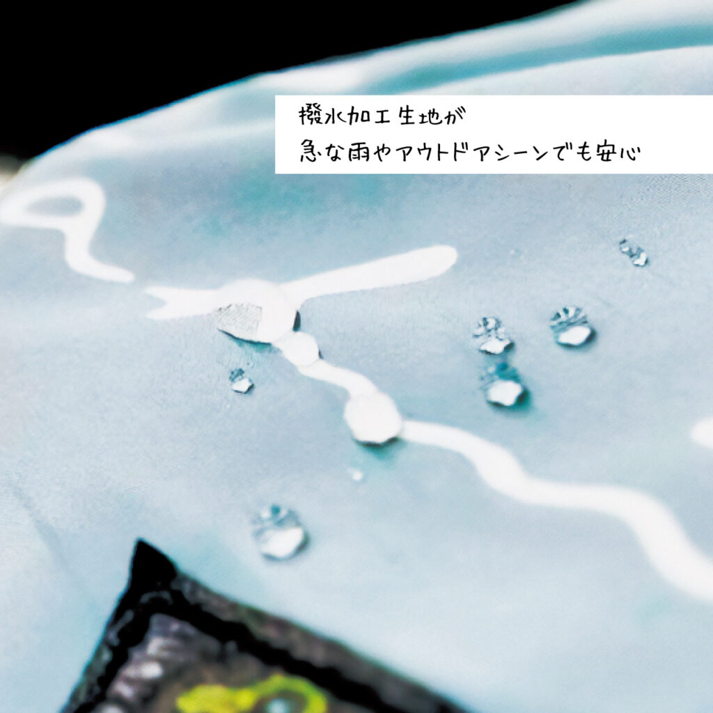 本体生地は撥水加工を施しているので、急な雨やアウトドアシーンでも安心して使えます。