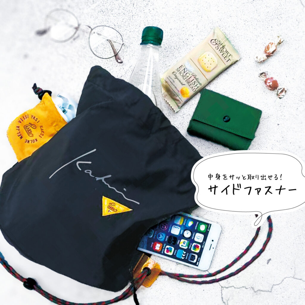 サイドファスナーが付いているから、中身をサッと取り出せます。巾着口はハトメ付きで、開閉もスムーズ。どちらからでもアクセスしやすいのが嬉しいポイントです♪