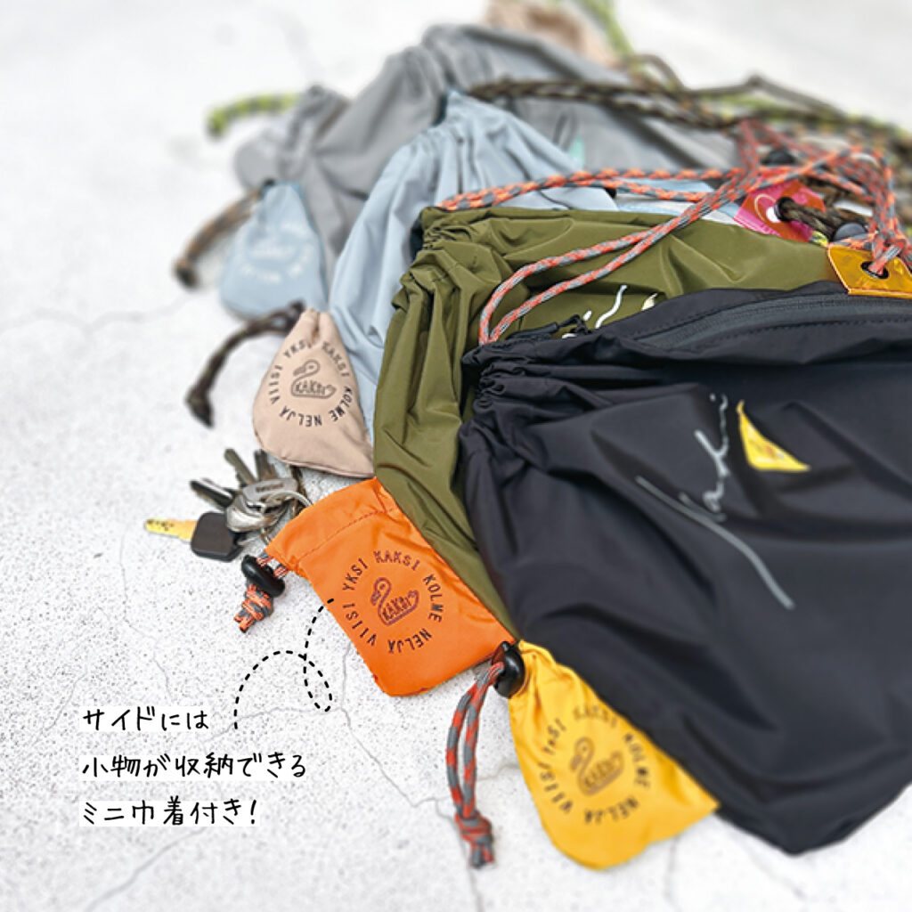 カジュアルな装いに人気の巾着サコッシュに、小物をすっきり収納できるミニ巾着をプラスしました。